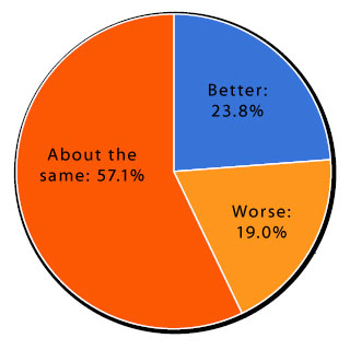 We find these results very interesting. While year-to-date performance in the respondents’ companies tends towards under-performance, perceptions compared to the previous year are roughly flat but companies are hiring and will be spending more. This could be due to any of multiple factors. For example, companies could be re-hiring and increasing budgets as a rebound from previous, overly conservative budget cuts. In other words, companies may have planned for a situation that was worse than the present, and therefore even though the present situation may not be good, hiring and increased spending have become necessary. Another common macroeconomic cause for increased hiring is decreasing workforce productivity. Additionally, some companies may increase spending in response to increases in spending at competitors in order to “keep up with the competition.” This discrepancy could also simply be a flaw in the survey, or perhaps a real difference in perception between the overall attitudes of life science tools companies and individual employees. There are many possible explanations, and we simply do not have enough data to evaluate all of the possible causes. All are free to draw their own conclusions.
