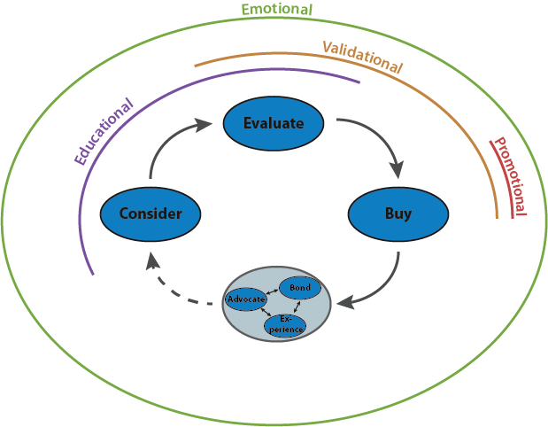 In this model, educational content would span from before consideration, where it may be used to catalyze realization of a need, through the early evaluation phase, where it helps shape the customer’s understanding and perception of the need and influences the criteria by which potential solutions will be evaluated. Validational content should be deployed from the late consideration phase through the evaluation phase in order to reinforce the brand’s proposed solution. Promotional content should be leveraged late in the evaluation phase up to the point of purchase in order to induce the customer to initiate a purchase.
